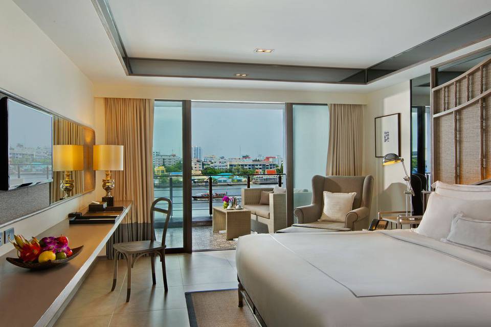 The Deluxe Riva Rooms at Riva Surya Bangkok feature 40 sqm of contemporary Thai furnishings and a large tiled balcony with panoramic views of the river.